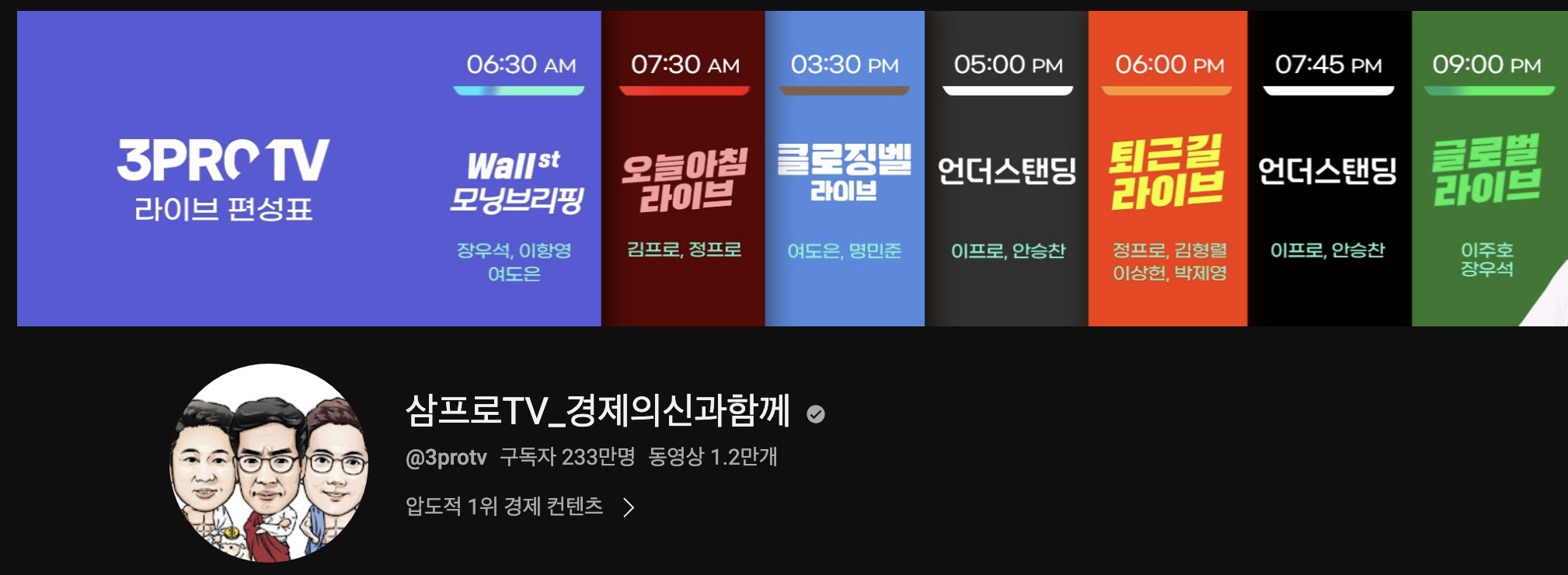 유튜브와 팟캐스트로 동시 송출하고 있는 경제 종합방송 채널. 금융 투자 전반을 다루는 유튜브 채널로 3명이 방송을 진행한다고 해서 삼프로TV다.